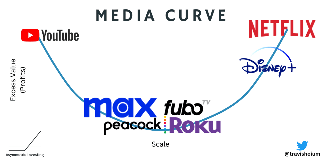 Based on the theories in Internet Economics and the Smiling Curve, it’s logical there will only be a small number of streaming companies that survive (the right side of the curve below), but those that do will be extremely valuable.