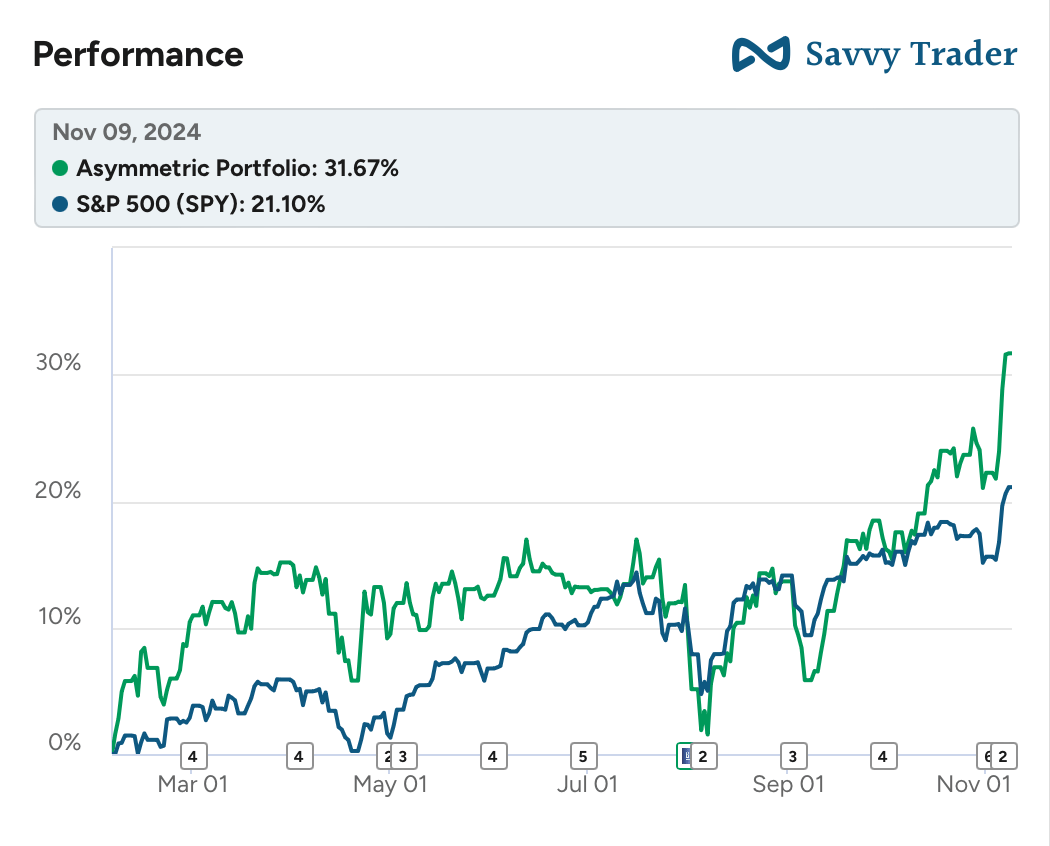 As I mentioned, the Asymmetric Portfolio did have a great week and is now beating the market by over 10% since tracking started on Savvy Trader. Over the past year, the portfolio is up 54%!