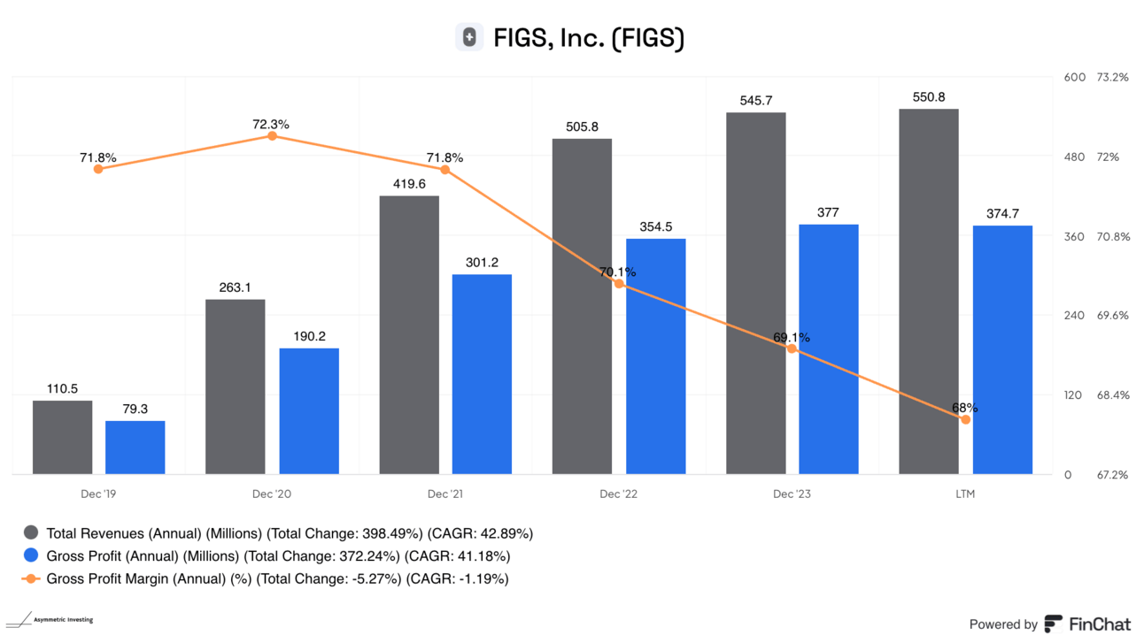 The number of SKUs Figs carries is high, but it has the scale in this niche to make it profitable. Niche scale is the moat, and this is where Figs’ gross margin of 68% is so impressive. That puts brands like Lululemon (59%) and On Holding (60%) to shame. Management has said margins are only below 70% because of a mix shift to lower margin, lower volume new products.