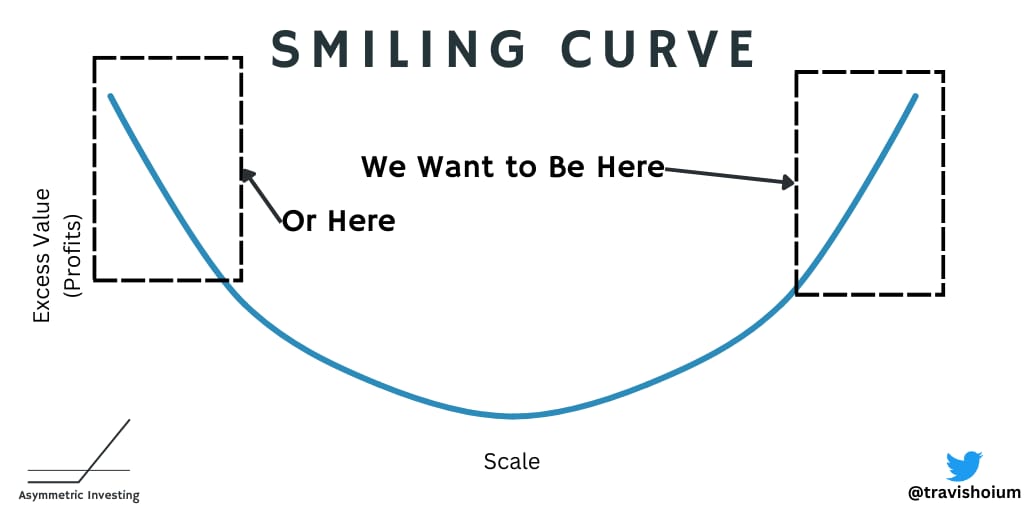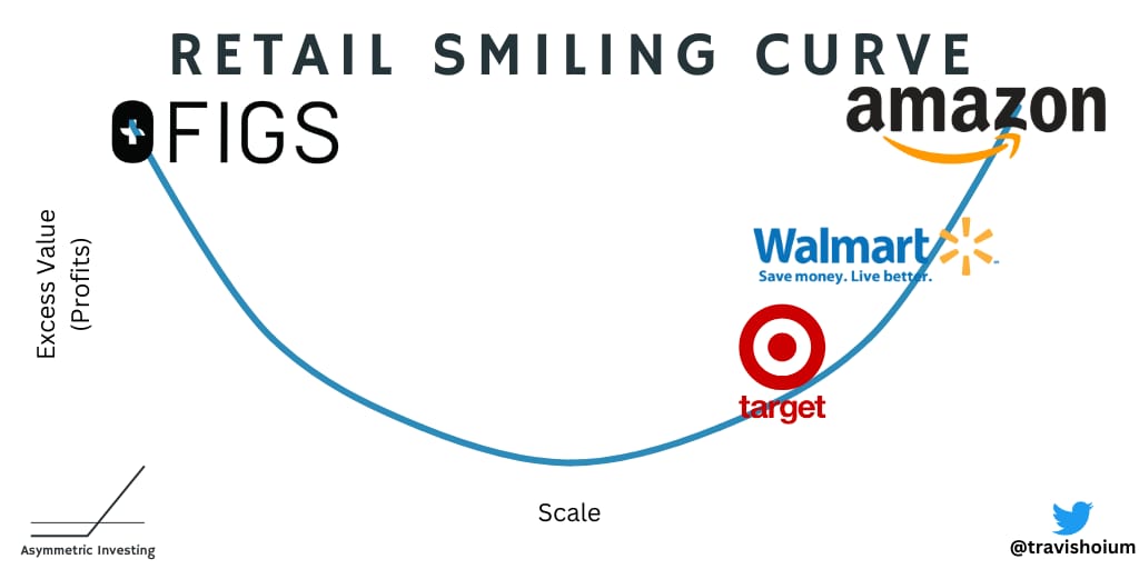 The best way to think about the company’s strategy is with the Smiling Curve, but instead of being in the top right — like Asymmetric Universe stocks Google, Spotify, Peloton (fitness), and Disney (streaming) — we are looking at a company that’s in the top left in retail.