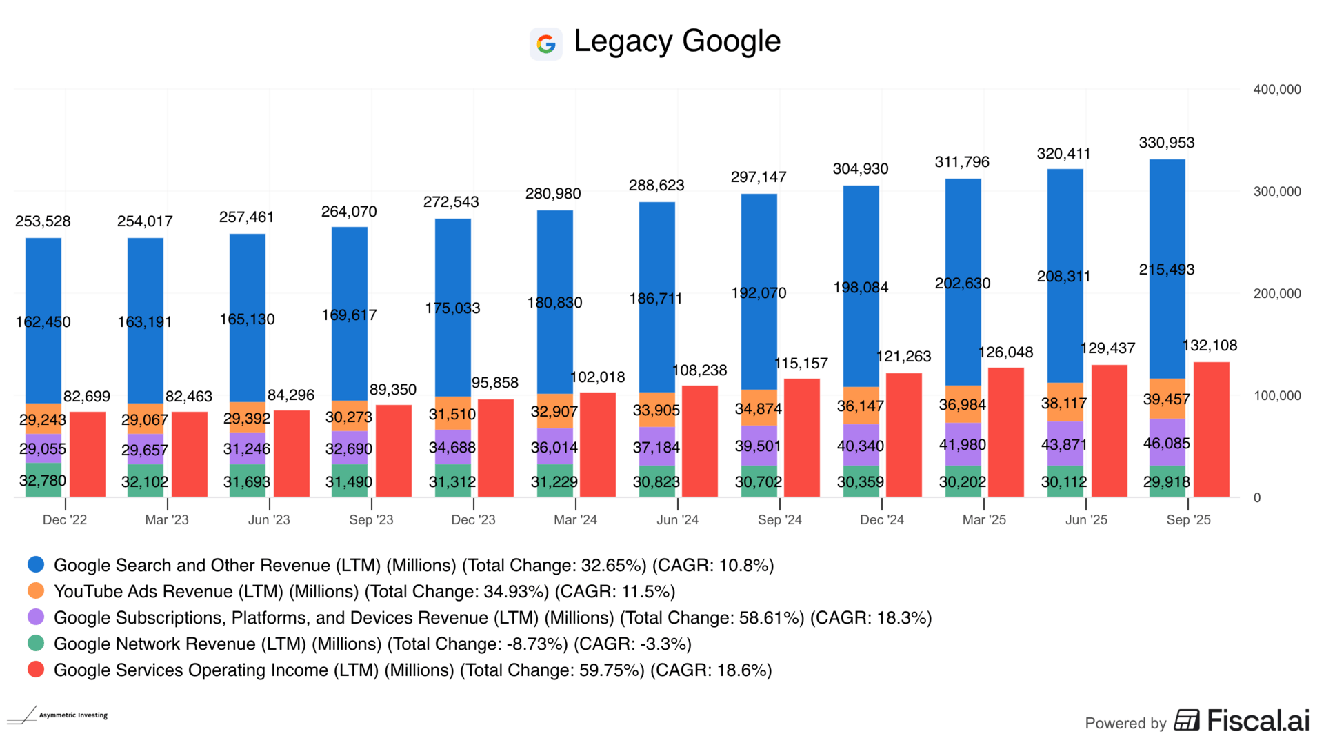 You can see below that legacy Google is steadily growing, and operating income is going up. Ten blue links may be changing, but they’re not being disrupted.