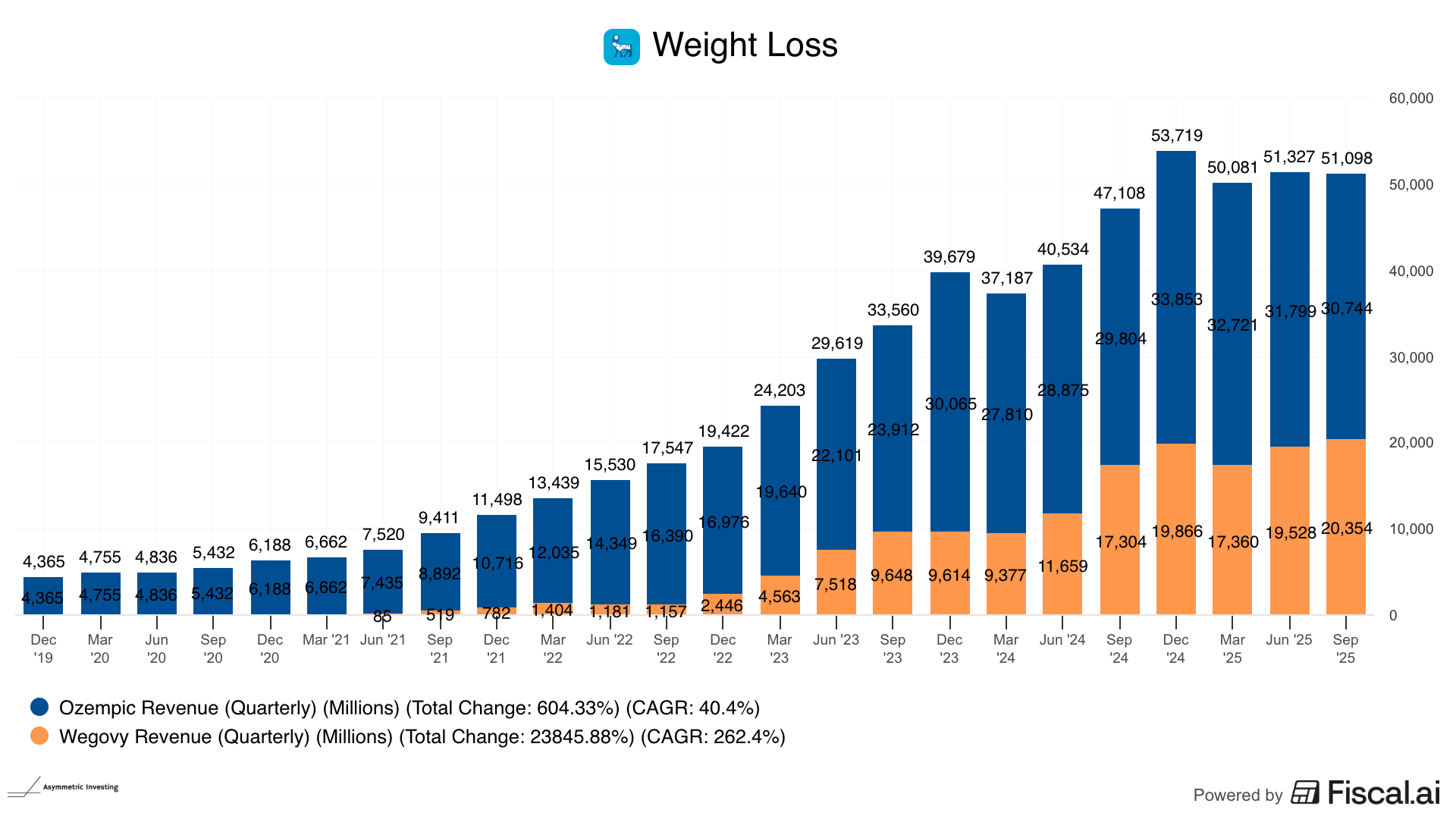 Disclosure of discussion with Novo Nordisk to bring Wegovy and a new oral solution to market was news the market liked. Remember, this is the same company that a few months ago accused Hims & Hers of illegal compounding and sued a number of telehealth companies (notably not Hims & Hers). Novo’s lawsuits have not gone well, and you can see below that weight loss revenue has stalled out.