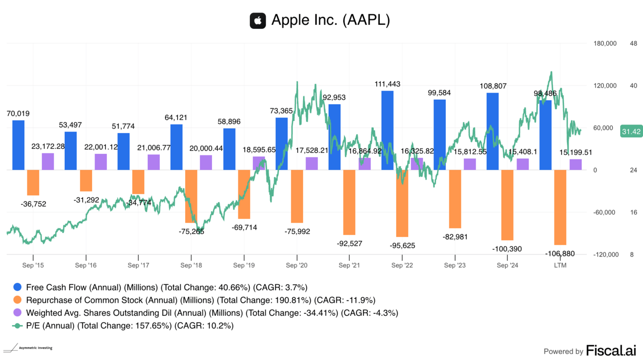 You may be surprised to learn that Apple’s free cash flow is up just 3.7% on a compound annual basis over the past decade. But the number of shares outstanding fell 4.3% and the P/E multiple expanded 10.2% on a compound basis. Add it up and you get a stock up 541% even before considering dividends.