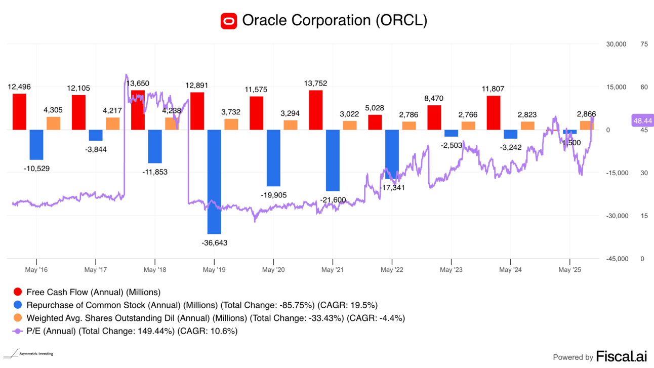 We don’t think about Oracle as a high-return company, but the stock is up 484% in the past decade before dividends despite just 5.0% compound revenue growth and falling cash flow. But the cash they did generate went to buybacks (and then some), and the P/E multiple rose at a 10.6% compound annual rate.