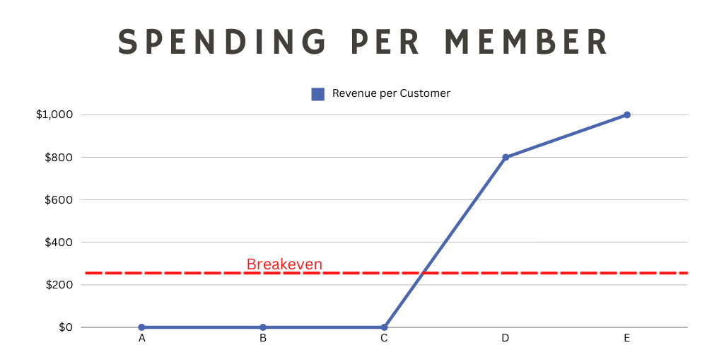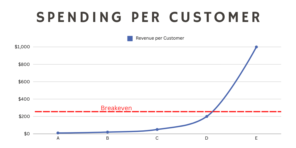 Let’s also assume the customer acquisition cost is $50 and our operating margin is 20%. This means customers need to spend $250 at Asymmetric Retail to be profitable.