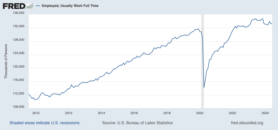Jobs: I’ve included a couple of charts below that I’ve been watching. The story emerging is full-time jobs stalling out in the U.S. while part-time jobs continue to rise. Jobs data is messy month to month but these charts show the trend back to the Great Recession and the trends look clear to me. I’ll be looking to hear more from companies (automakers and banks in particular) about the impact on demand and lending.