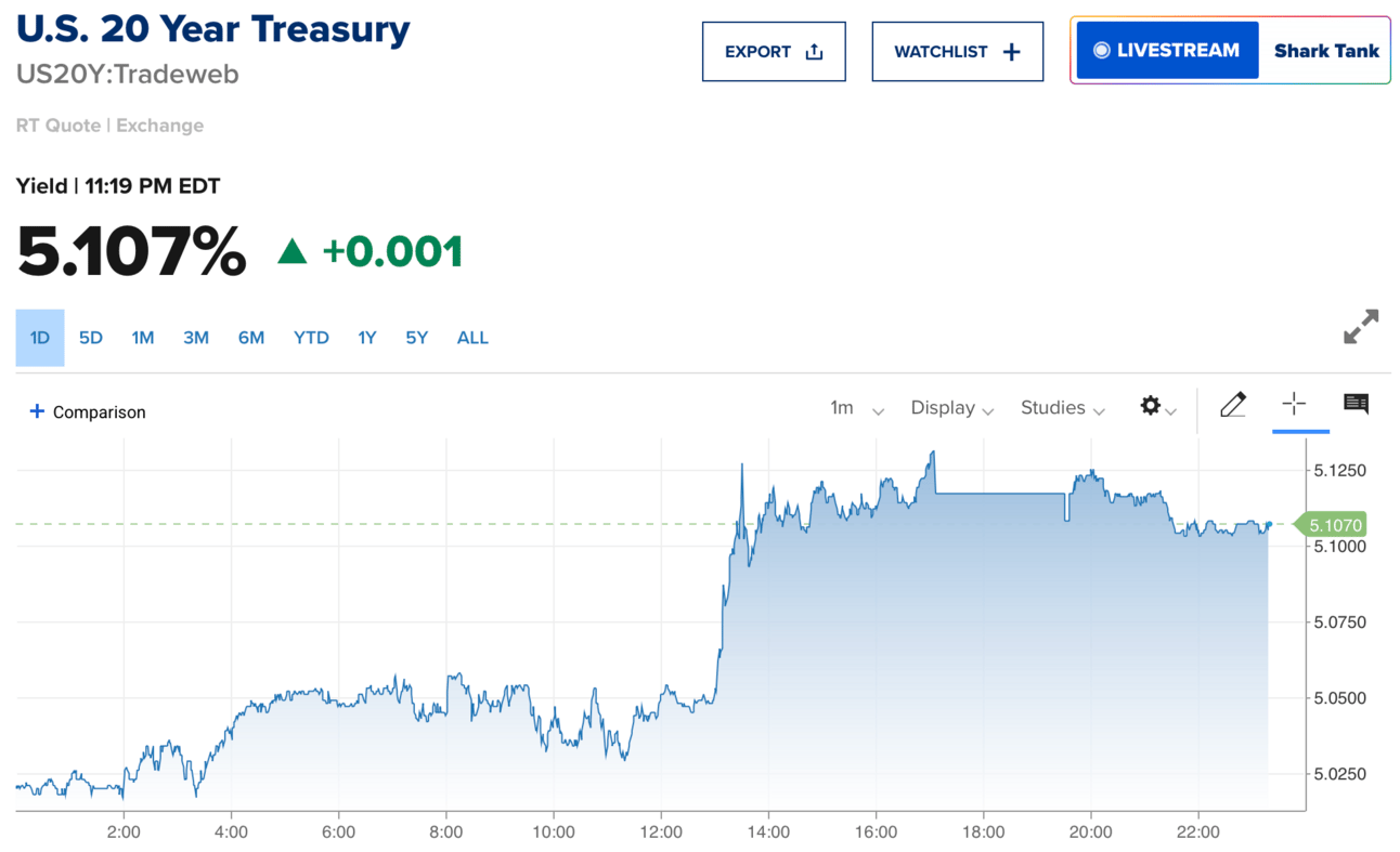 On Wednesday, 20-year treasury bond yields rose about 0.1% in a matter of minutes after a weak treasury auction. The resulting loss in value for bond investors was about 1.24% for a 20-year bond.