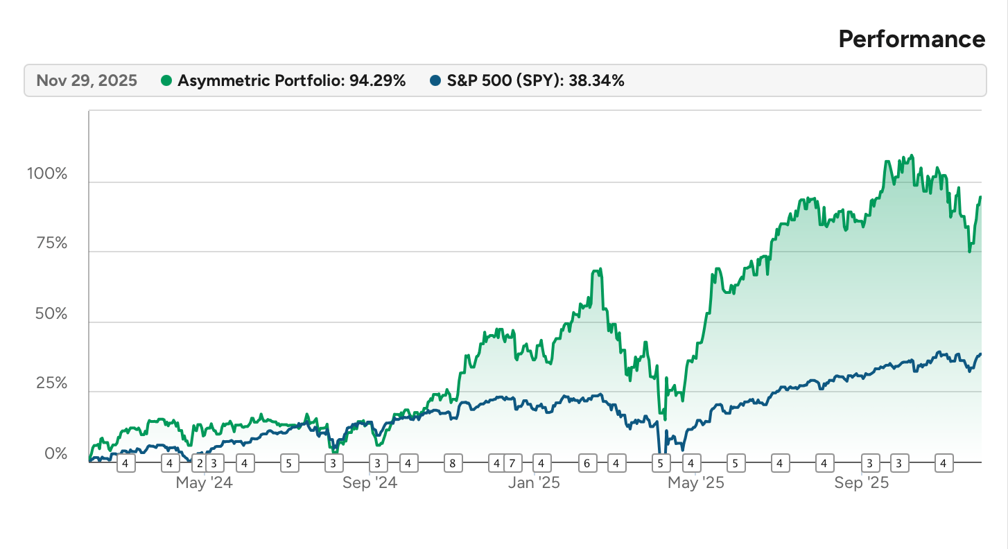 The Asymmetric Portfolio was certainly a beneficiary of the market’s great week. The portfolio jumped more than 10% this week alone.